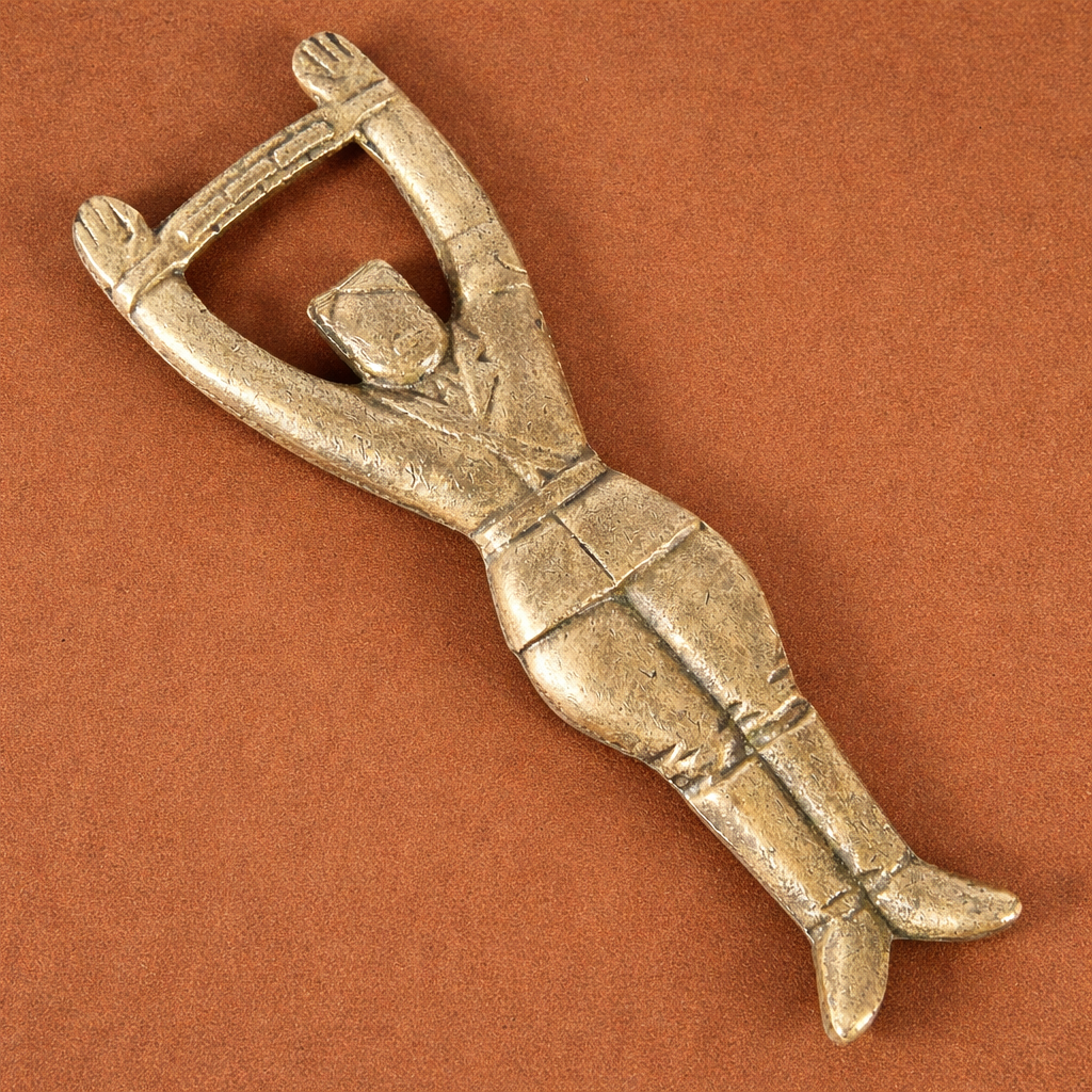 The Uplift is a handcrafted brass bottle opener shaped as a human figure, frozen in a timeless pose of lifted arms and quiet strength. Inspired by traditional folk forms, it feels less like a tool and more like an object with presence.
