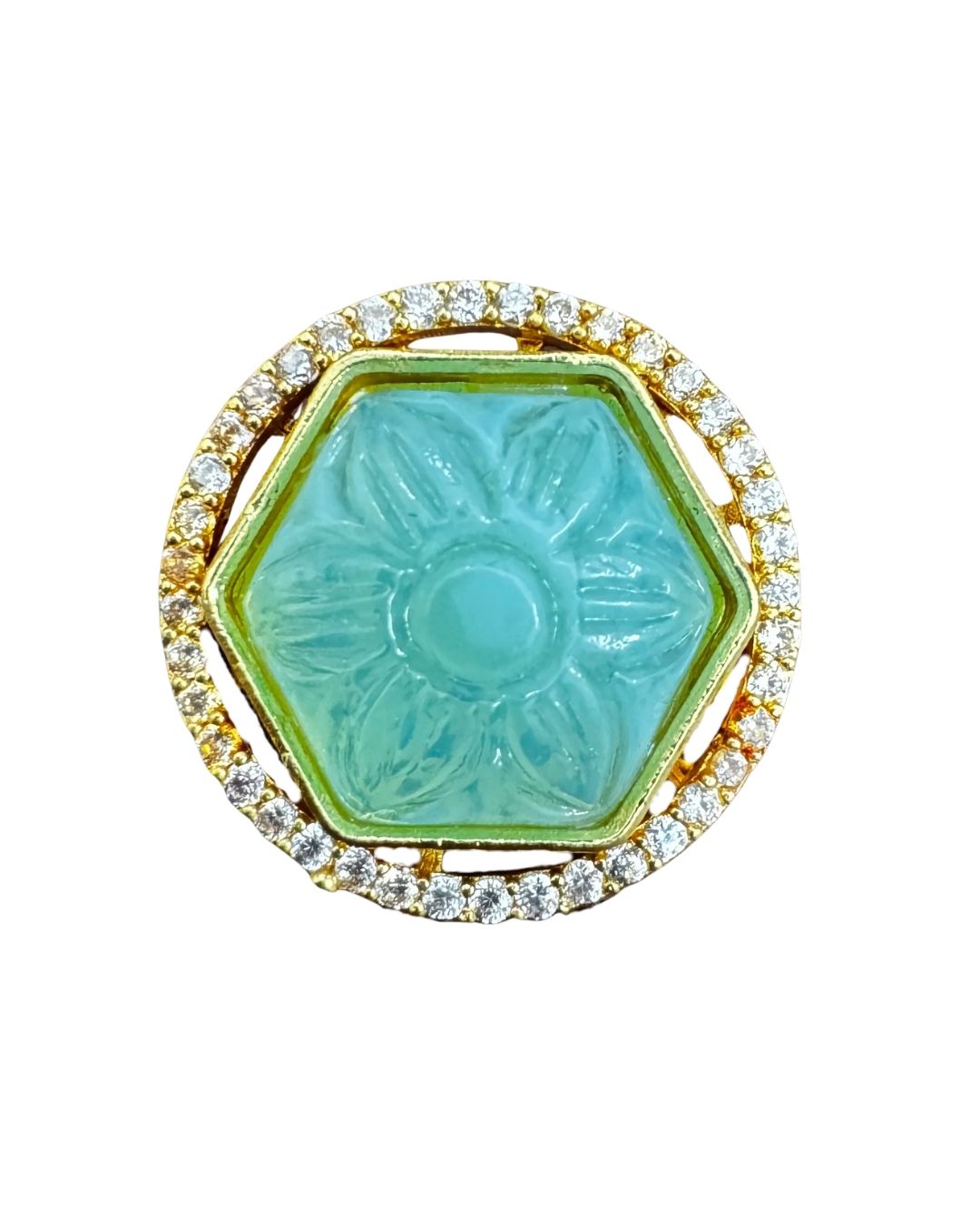 A soft aqua floral centre carved with delicate petal detailing sits inside a clean hexagonal frame, surrounded by a ring of sparkling crystals. The contrast between the cool pastel core and the warm gold-toned brass gives this design a refined yet festive character.