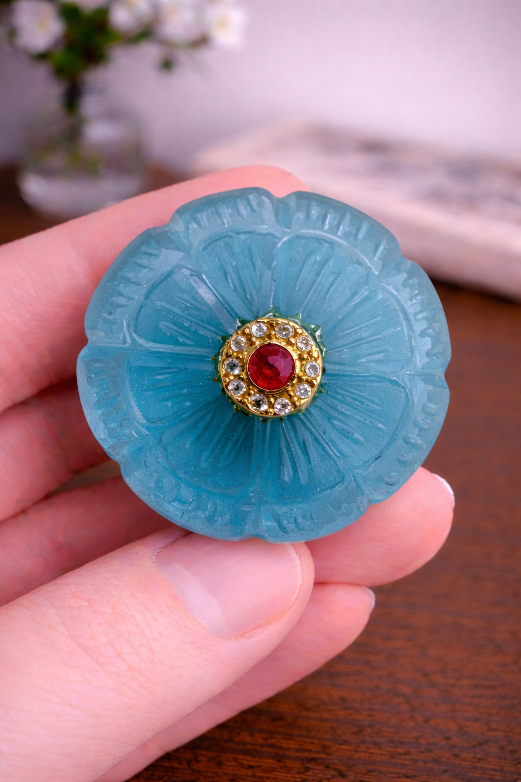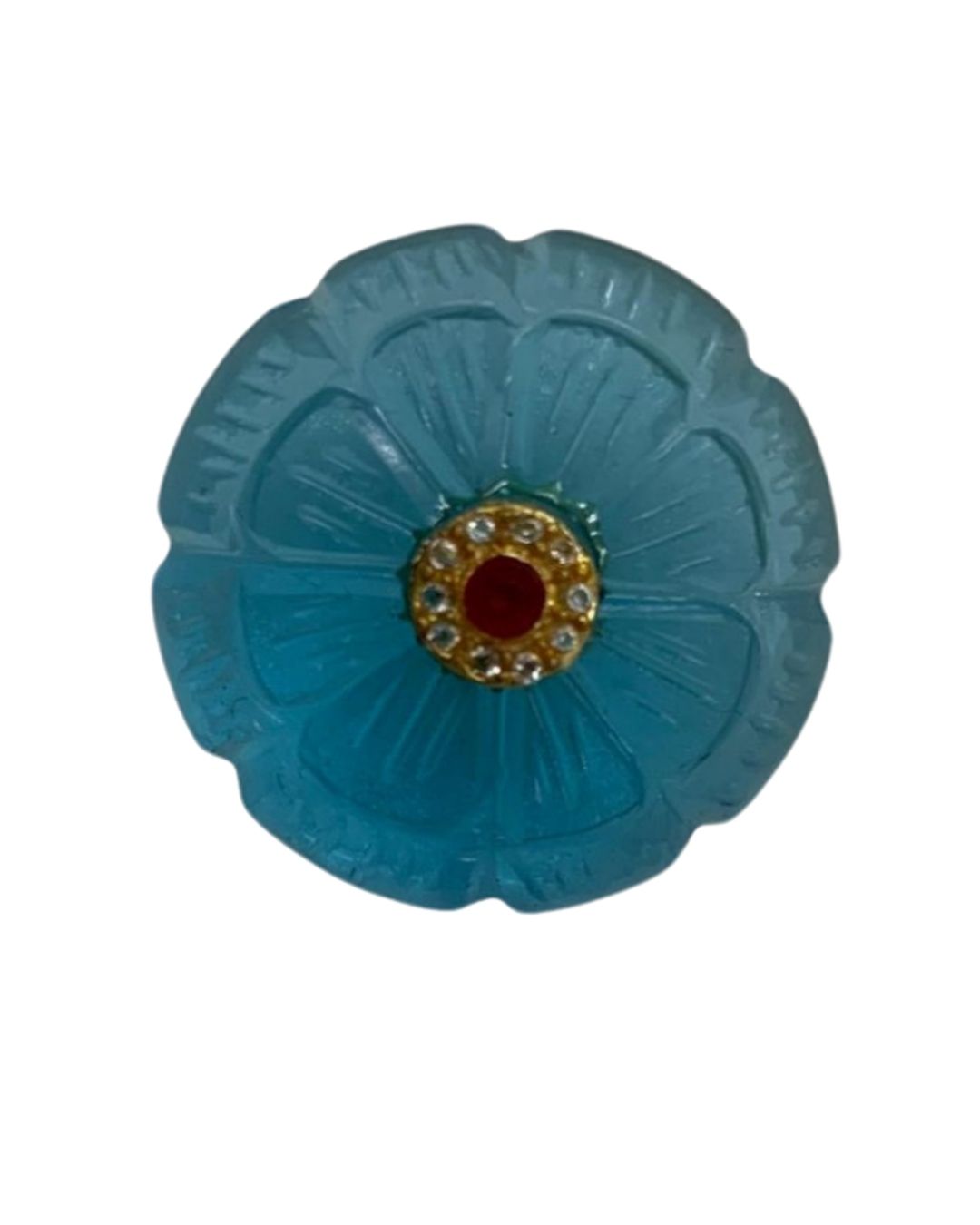 • Design: Carved aqua floral base with red stone center