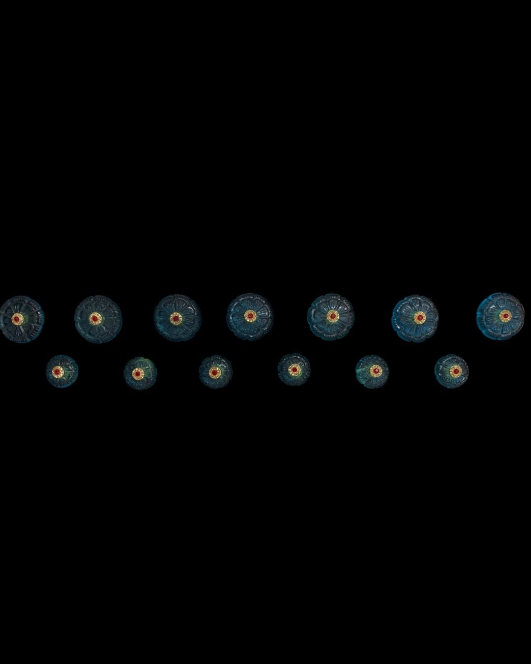 A 13-piece bandhgala button set inspired by floral artistry. The carved aqua-blue flower base creates a calm, refined presence, while the red stone center encircled with delicate crystal detailing adds richness and depth.