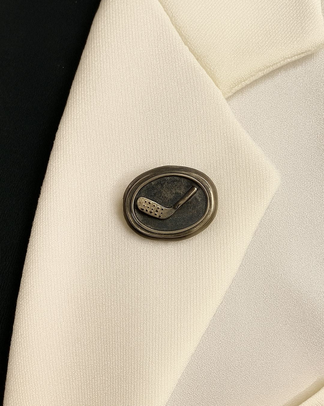 A rare vintage brooch crafted in solid silver, featuring an intricately detailed golf club motif within an oval frame. Its naturally aged patina enhances the character, making it a desirable collectible for golf enthusiasts and lovers of antique jewelry. Likely dating back several decades, this piece embodies both sporting history and fine craftsmanship. Ideal for display, collection, or as a distinguished accessory.