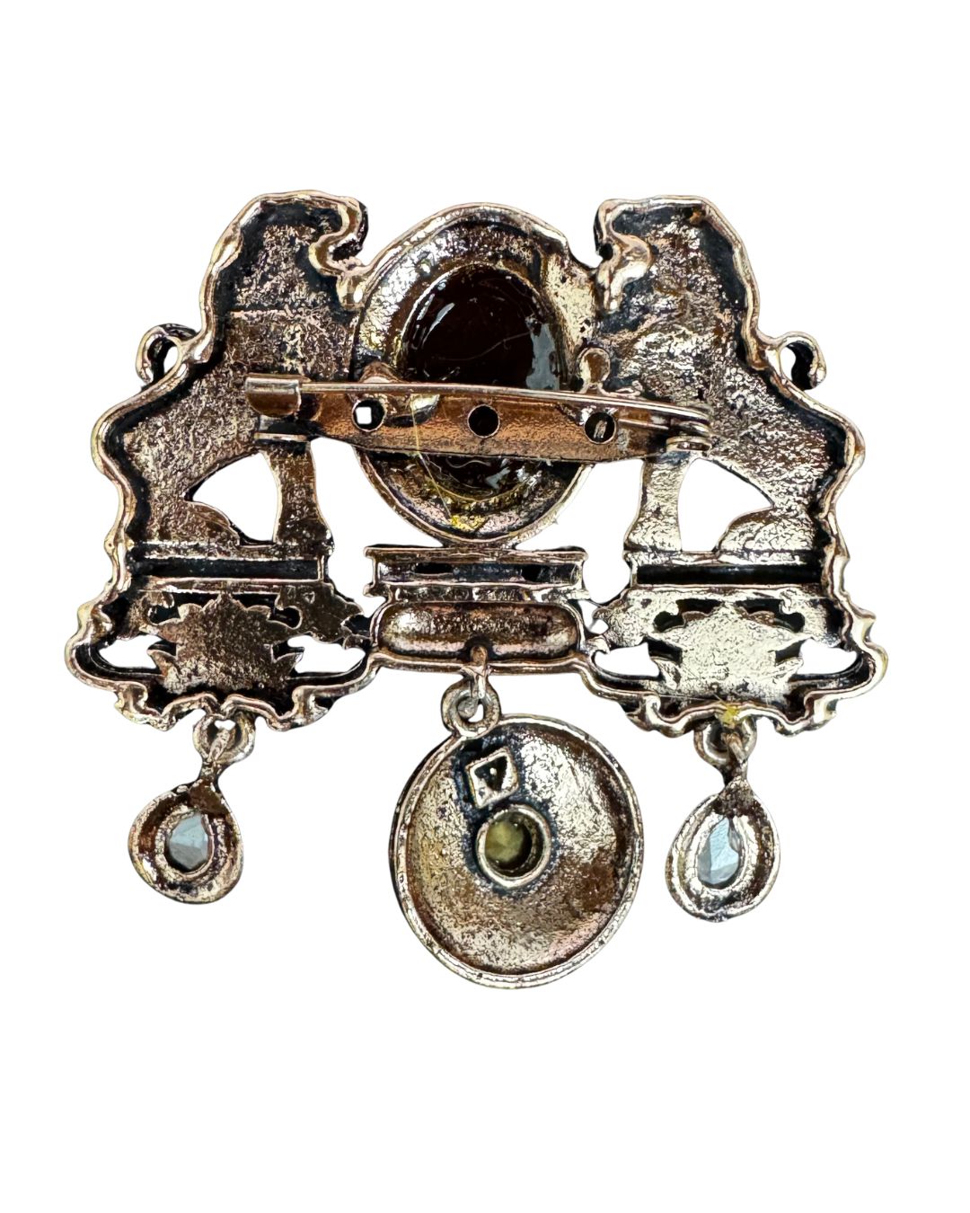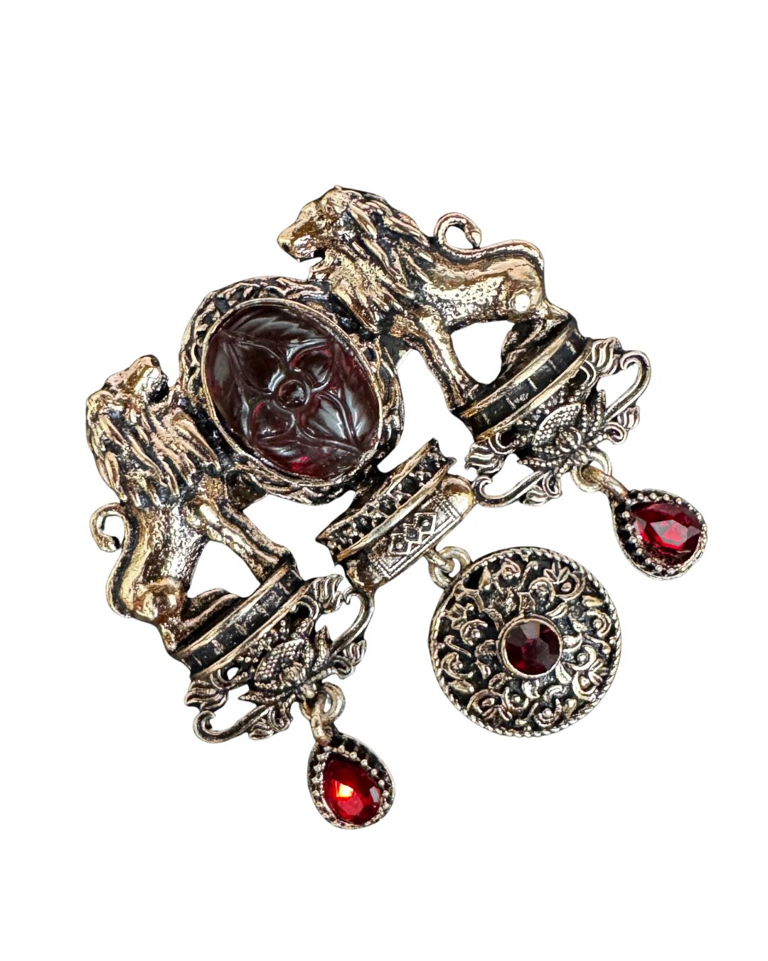 A statement brooch inspired by royal crests and timeless heraldry. Two sculpted lions stand in strength and symmetry, framing a carved central stone that anchors the design. Below, delicate dangling elements with ruby-red stones add movement and depth, catching the light with every step.