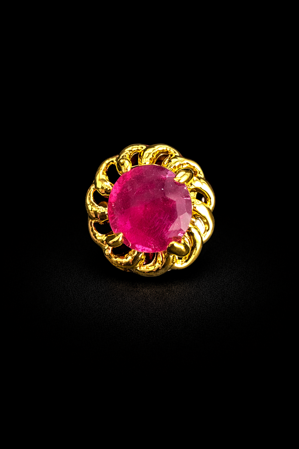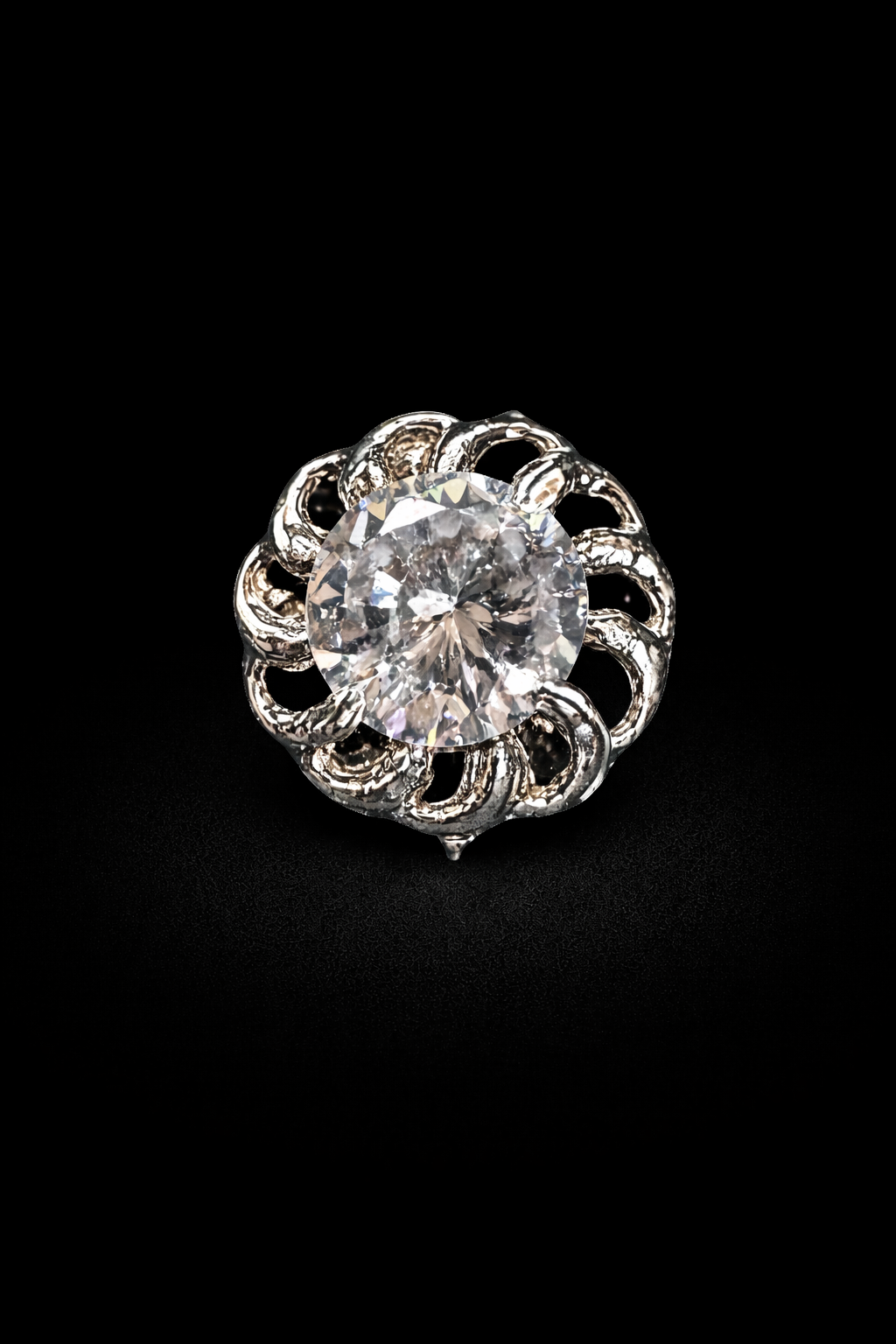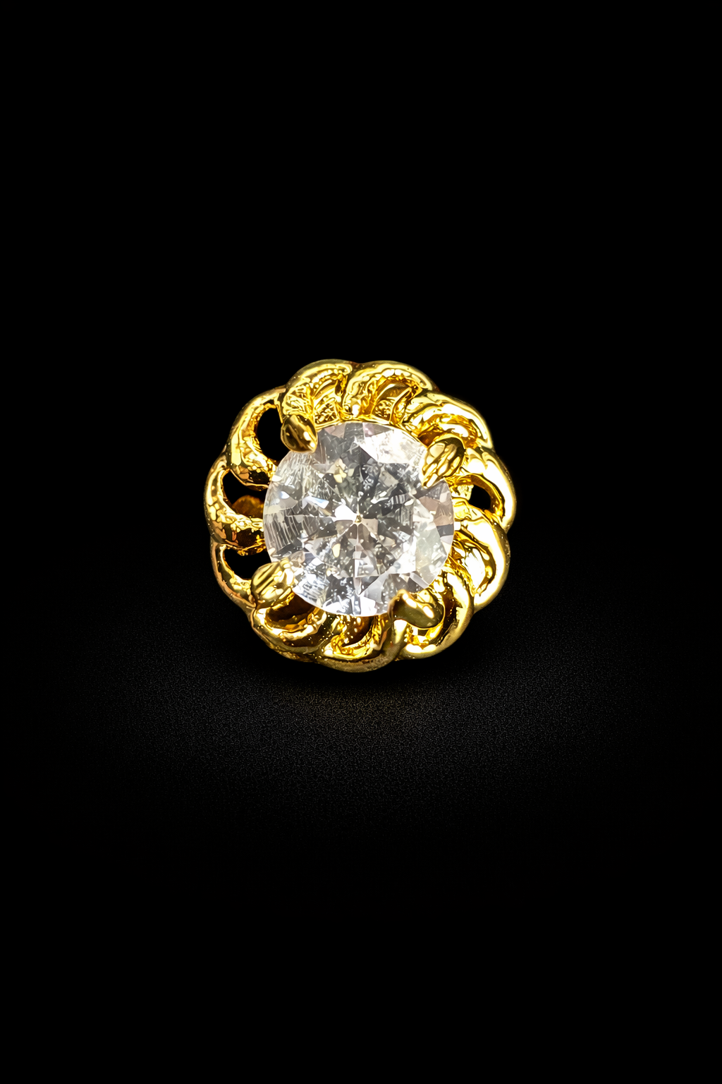 A sophisticated kurta button featuring a brilliant clear crystal set in an elegant swirling metal frame. The intricate circular design enhances the brilliance of the stone while adding depth and texture. Perfect for festive wear and classic ethnic styling.