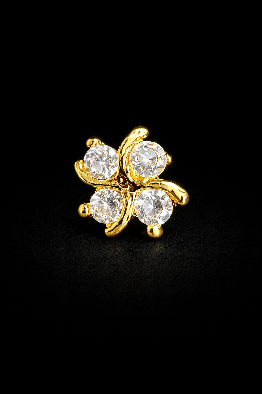 An elegant kurta button featuring four brilliant crystals arranged around a flowing gold vine-inspired design. The organic curves of the gold frame give the piece a refined, artistic character while the sparkling stones add a touch of festive brilliance. A perfect detail to elevate traditional and celebratory outfits.