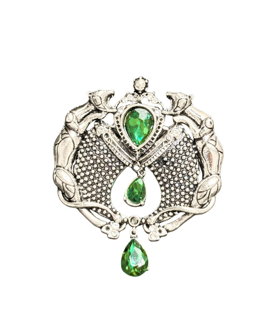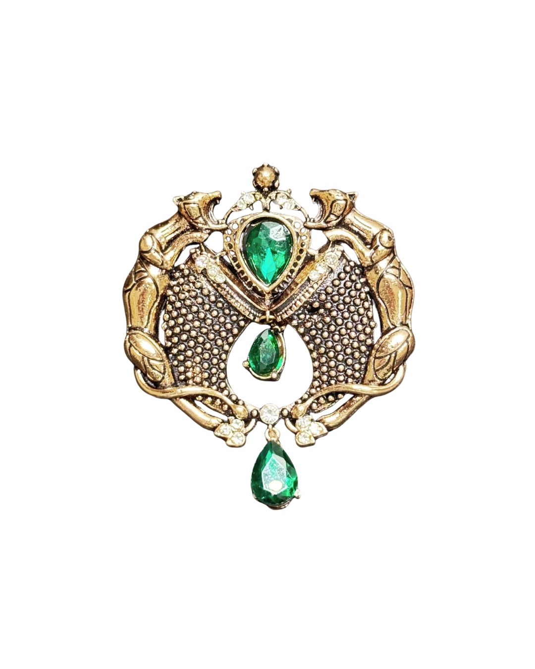 A bold statement piece crafted in detailed metalwork, this brooch features twin panthers forming a regal crest around vivid emerald-green stones. The layered textures, sculpted forms, and dangling gemstone drops create movement and depth, making it impossible to ignore. Designed for those who prefer their style powerful yet refined, this brooch elevates blazers, bandhgalas, shawls, and occasion wear with ease.