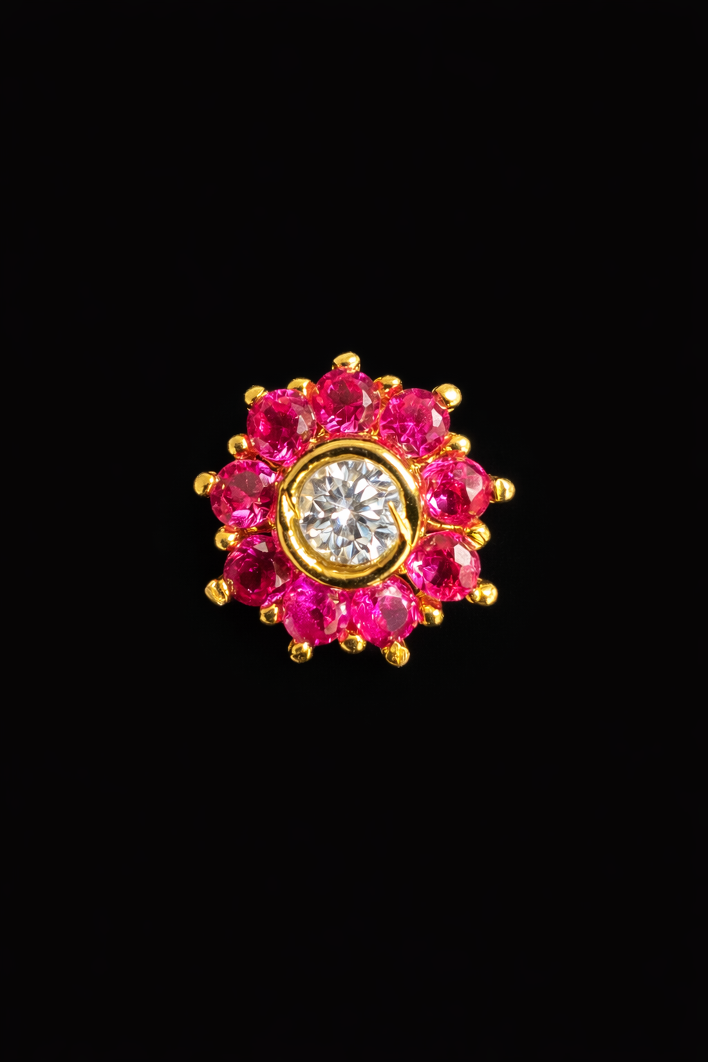 The Emerald Sunburst kurta button is designed with a circular arrangement of vivid green stones forming a bright halo around a sparkling crystal center. The gold setting enhances the richness of the emerald tones, giving the piece a regal yet fresh character. Perfect for festive kurtas, wedding attire, or traditional celebrations where refined details elevate the look.