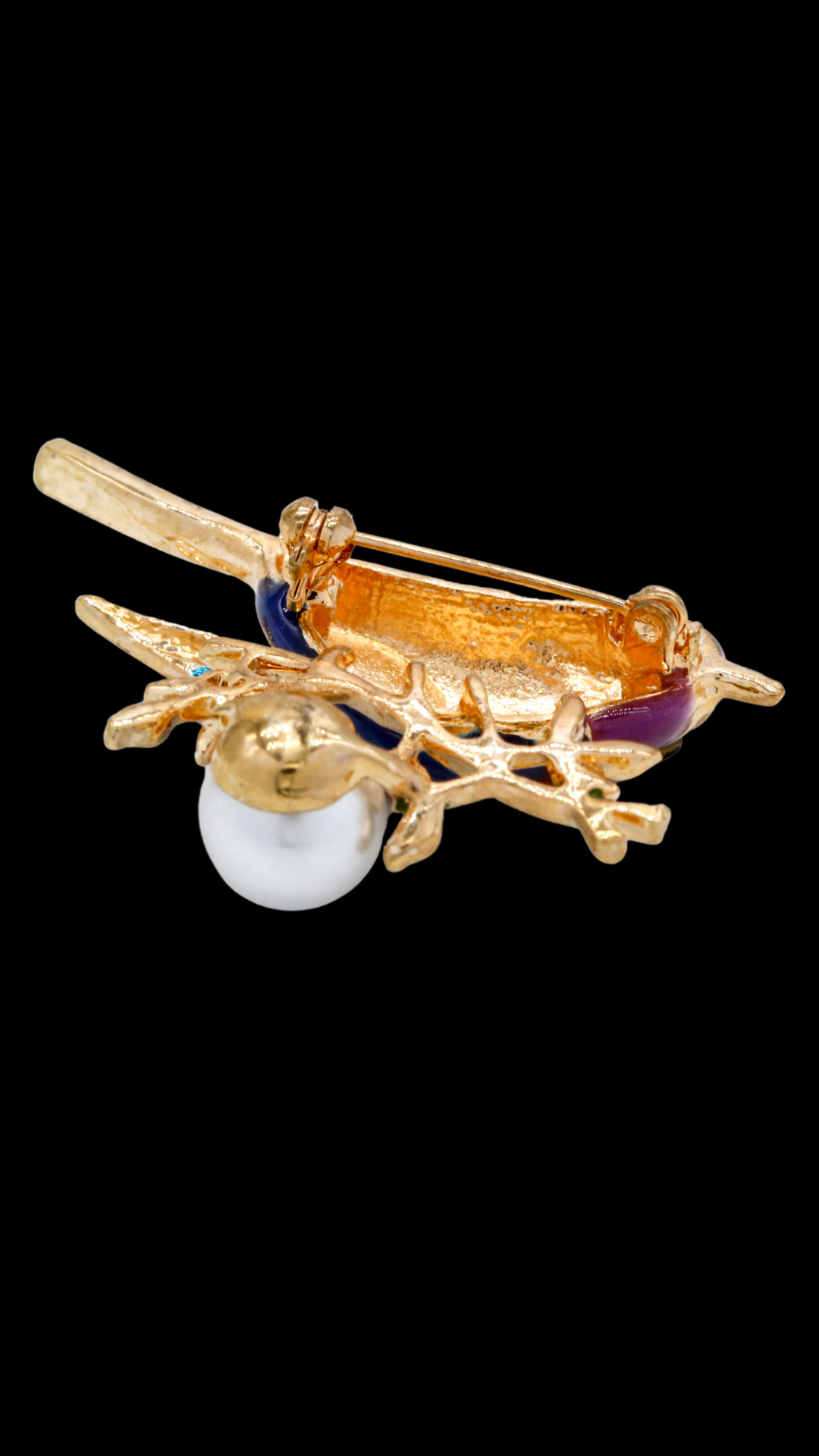 This hand-finished bird brooch captures the quiet beauty of nature in vivid enamel tones and delicate gold detailing. Perched on a leafy branch, the bird features rich shades of violet, sapphire blue, and warm coral, finished with a luminous pearl drop that adds soft movement and glow.