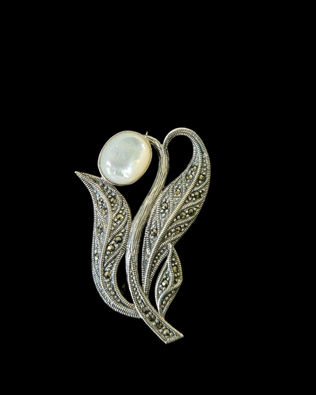 A graceful creation that marries timeless elegance with intricate craftsmanship. This brooch features a luminous pearl cradled delicately within ornate sterling silver leaves, adorned with fine filigree and sparkling marcasite accents. Symbolizing purity and growth, Pearl Bloom is more than just an accessory — it’s a statement of refined sophistication, perfect for adding a touch of vintage charm to any attire.