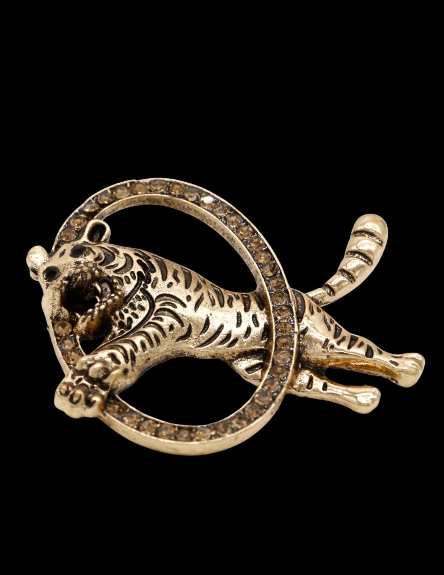 This tiger brooch captures the animal in full movement, frozen in a bold leap through a crystal-lined circle. The sculpted body, etched stripes, and open jaws give it a strong presence that feels alive on fabric.