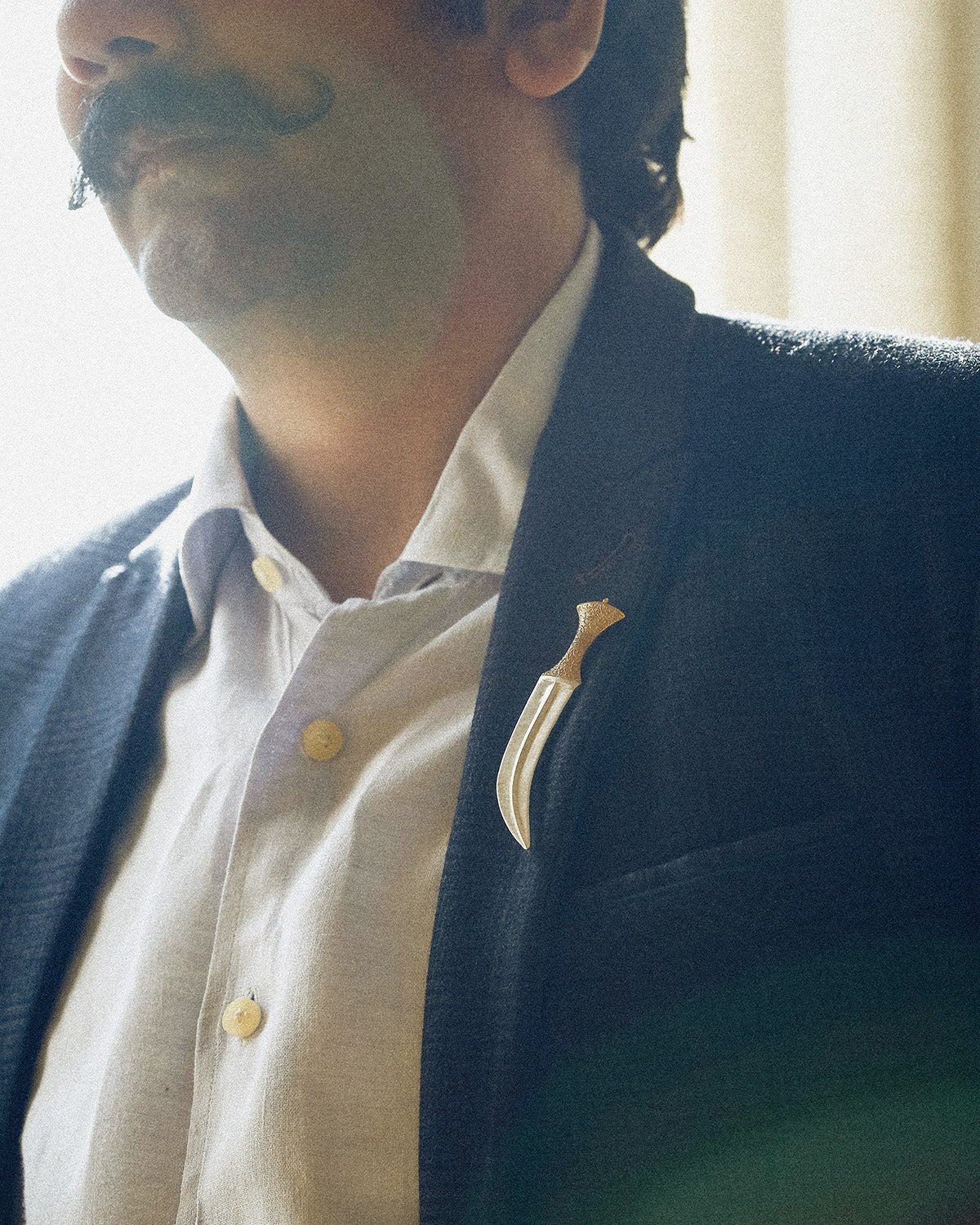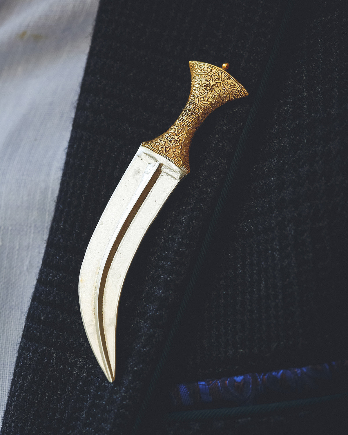 Presenting Jambiya, a brooch pin artfully designed in pure silver. It draws inspiration from the traditional Jambiya dagger of Yemen, a symbol of prestige and valour. This homage not only captures elegance but also highlights the deep historical ties between Yemen and India, where Yemeni mercenaries were once prominent in princely courts. Add the elements of the forgotten past and glorious history to your style with this fusion of cultural heritage and exquisite craftsmanship.