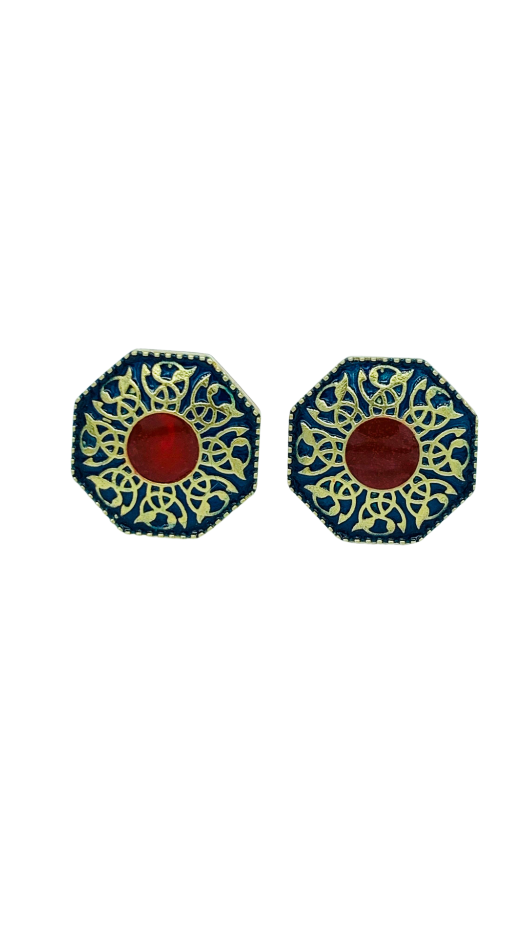 Handcrafted in 925 sterling silver, feature an octagonal design intricately filled with meenakari-style enamel work in deep navy and rich crimson, finished with intricate silver work.