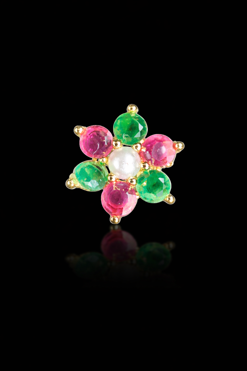 Inspired by traditional Navratna jewellery, this kurta button features a beautiful arrangement of multi-coloured stones including green, pink, blue, and red around a pearl-like centerpiece. The design brings together vibrant hues and classic craftsmanship, making it an ideal accessory for ethnic and festive wear.