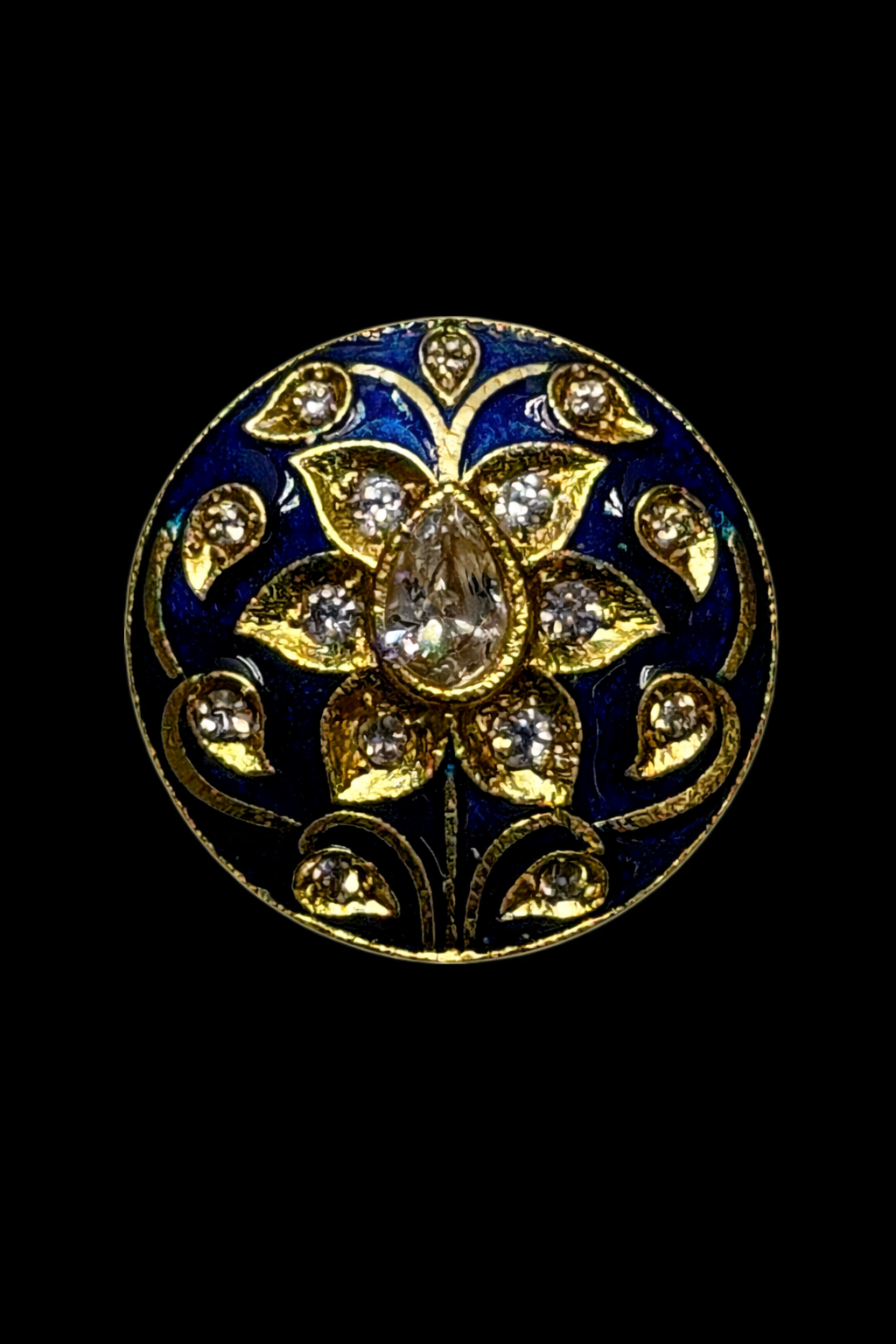 Crafted in brass, this 13-piece button set features a floral motif set against a deep blue enamel base, highlighted with gold detailing and kundan-style stones. At the center sits a pear-shaped stone, surrounded by petal-like forms that give the design depth and movement.