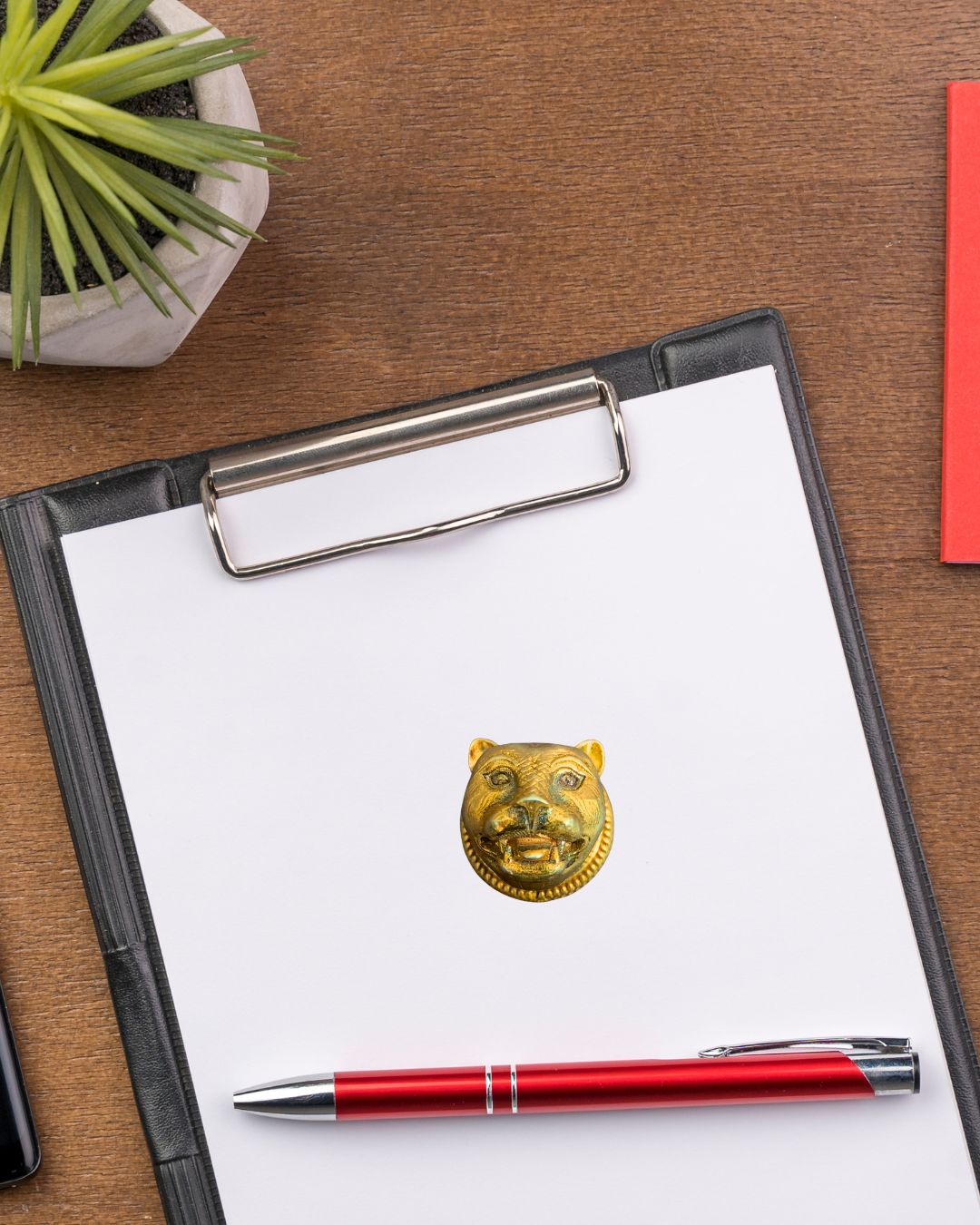 The detailed engraving showcases expressive features — sharp eyes, textured mane, and bold teeth — giving it a regal and lifelike presence. With its solid weight and fine craftsmanship, it serves as both a functional desk accessory and a decorative collectible.