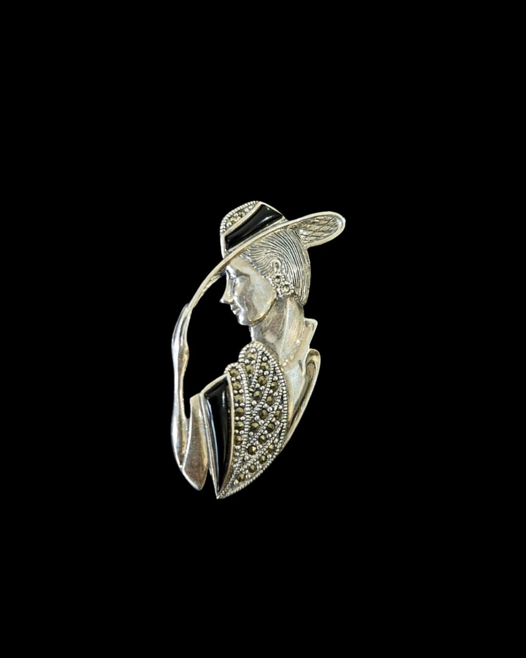 An ode to timeless sophistication, this brooch captures the graceful silhouette of a lady in a wide-brimmed hat, exuding poise and mystery. Crafted in sterling silver with intricate detailing, it features marcasite accents and polished black enamel that highlight the folds of her attire. The Lady in Elegance is not just a jewel, but a miniature artwork — a perfect blend of vintage glamour and artistic finesse, ideal for those who appreciate classic style with a modern edge.