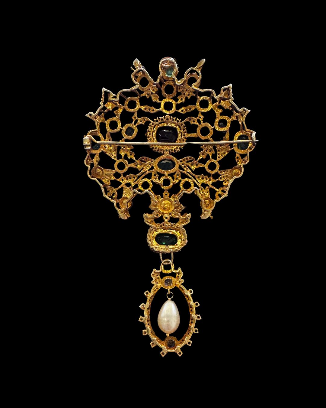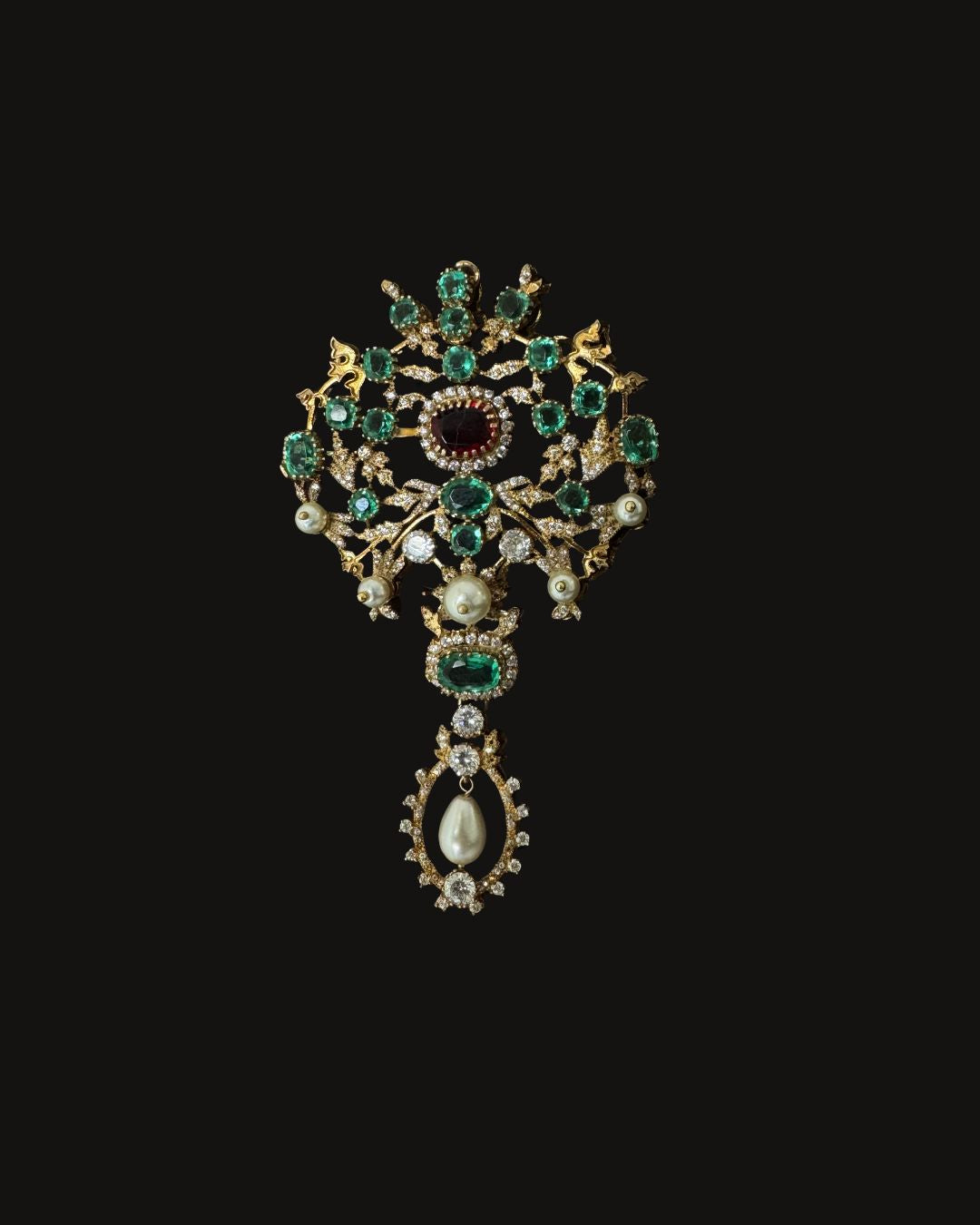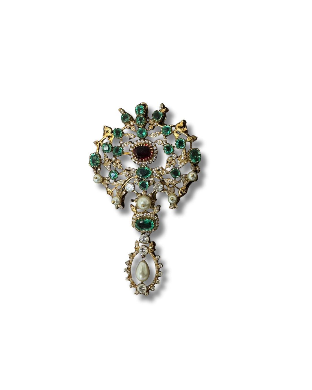 This brooch carries the kind of detail you usually only see in old royal heirlooms. The rich cluster of stones forms the heart of the design, anchored by a deep red centerpiece that immediately draws attention. The gold latticework has a delicate, almost floral rhythm to it, dotted with pearls and clear stones that add a soft glow.