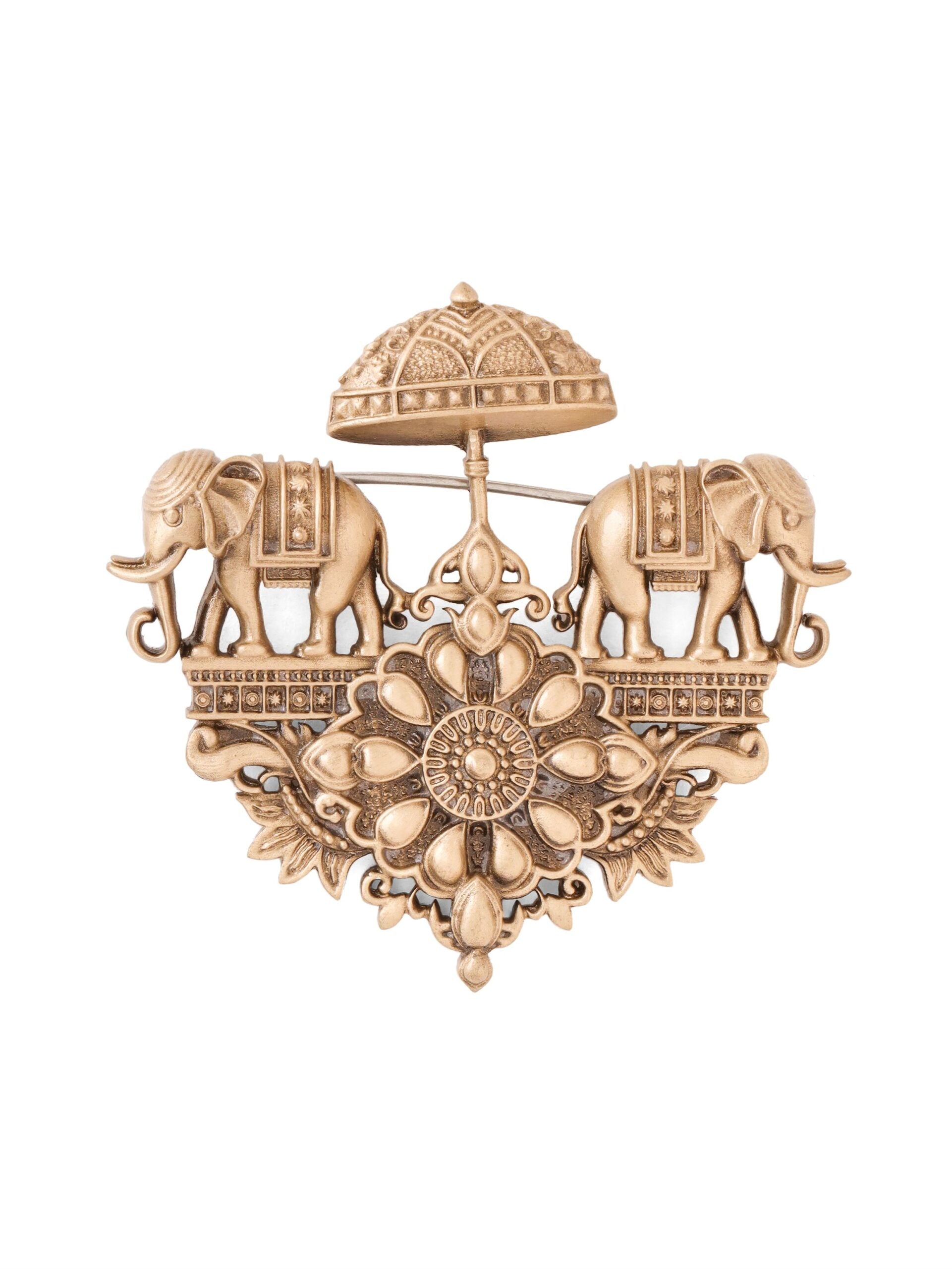 This brooch draws inspiration from classic Indian royal processions. Twin elephants stand in perfect symmetry beneath a traditional ceremonial umbrella, anchored by an intricate floral motif at the center. The antique gold finish gives it a warm, heirloom feel, while the detailed carving brings depth and character to the piece.
