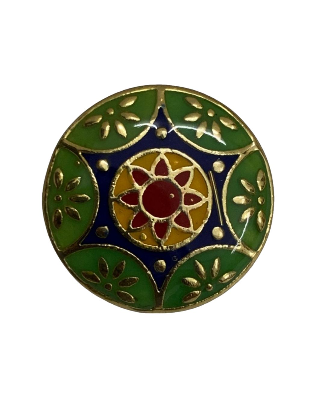 This 13-piece brass button set brings together traditional meenakari artistry and timeless royal elegance. Designed in a vibrant circular floral pattern, each button features a detailed red and yellow sun-inspired centre, framed by deep blue enamel and rich green petal segments. Fine gold-toned detailing enhances every section, creating depth, contrast, and a luxurious finish.