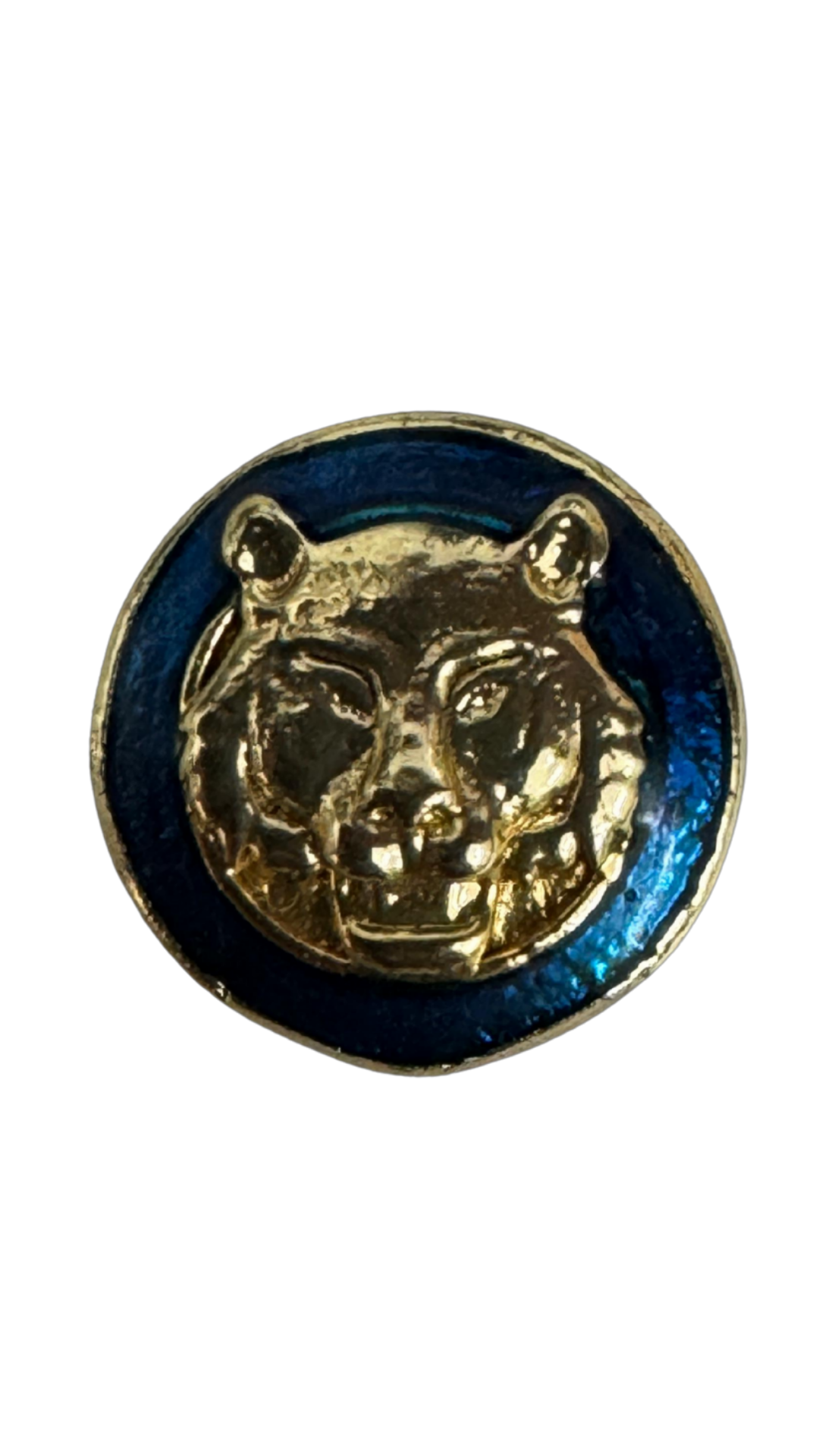 A bold panther motif sculpted in gold-tone brass, set against a deep blue enamel base. Strong, striking, and designed to make a statement with traditional wear.
