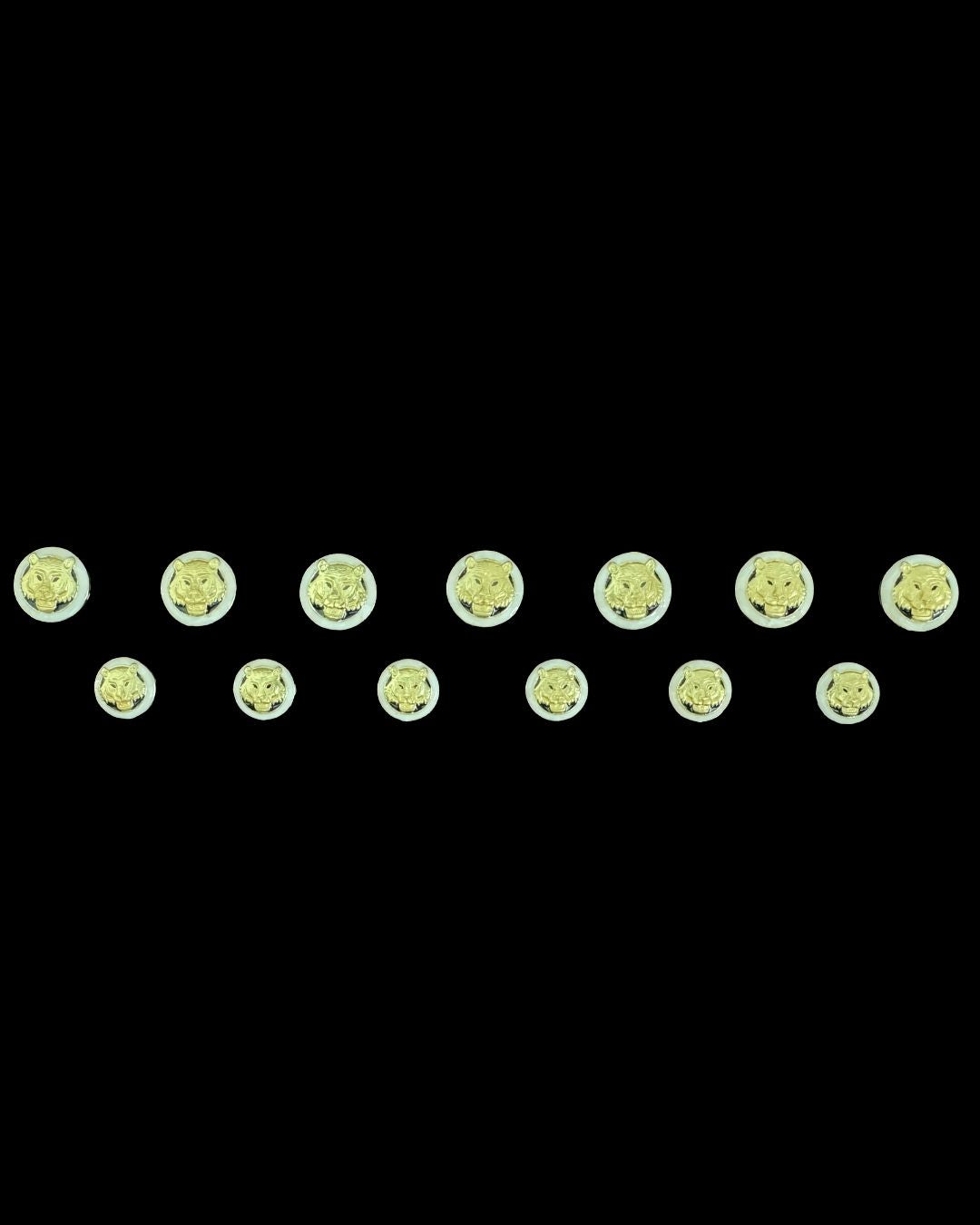 This 13-piece bandhgala button set features a sculpted tiger head in rich gold-toned brass, set against a bold enamel ring. The textured finish brings out the sharp lines of the face, giving it depth, character, and unmistakable presence.