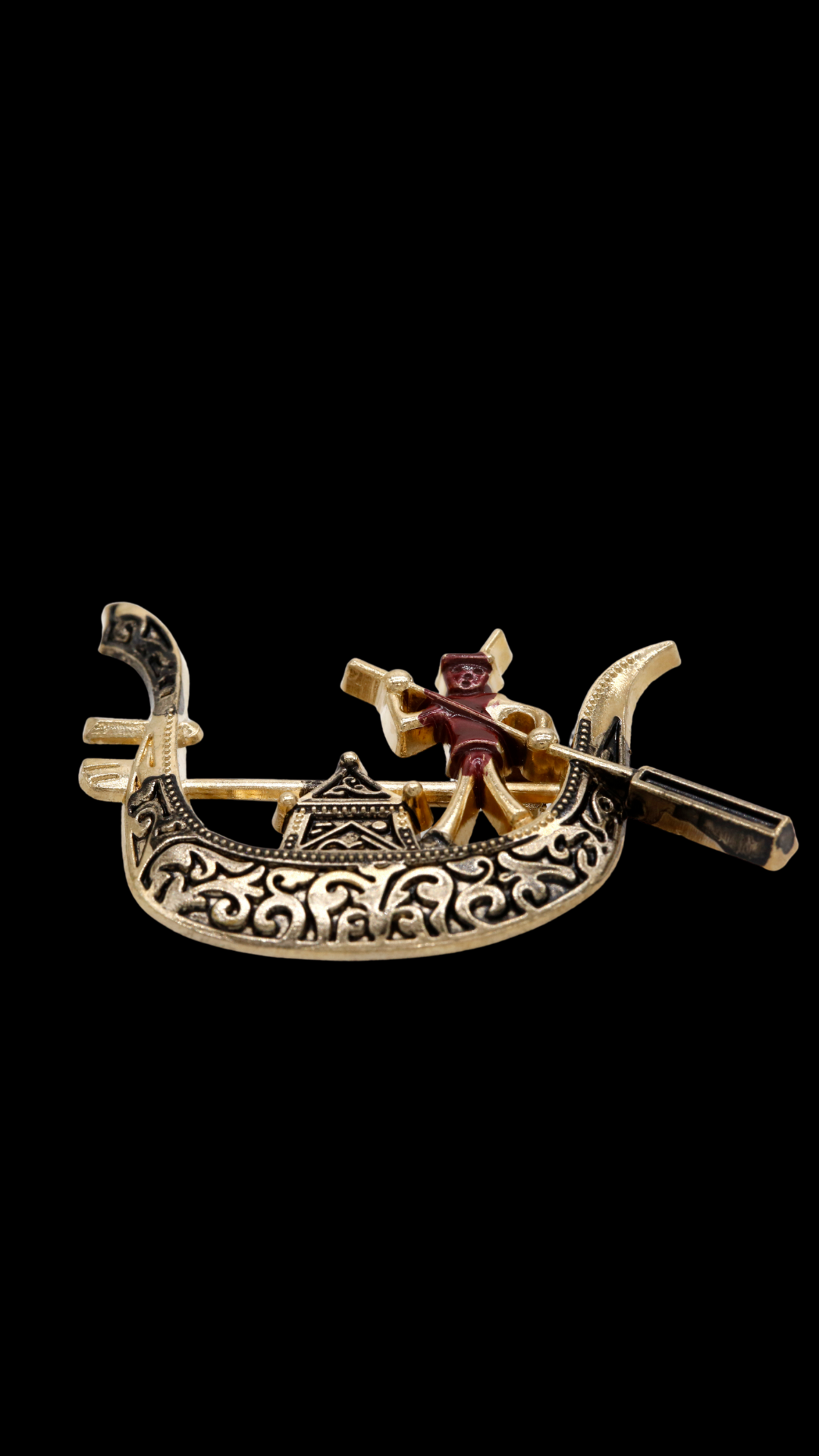 This heritage boatman brooch draws from India’s river traditions, where lone oarsmen guided travelers across slow, winding waters. The curved hull is etched with ornamental patterns, while the sculpted boatman stands mid row, creating a sense of movement frozen in time.