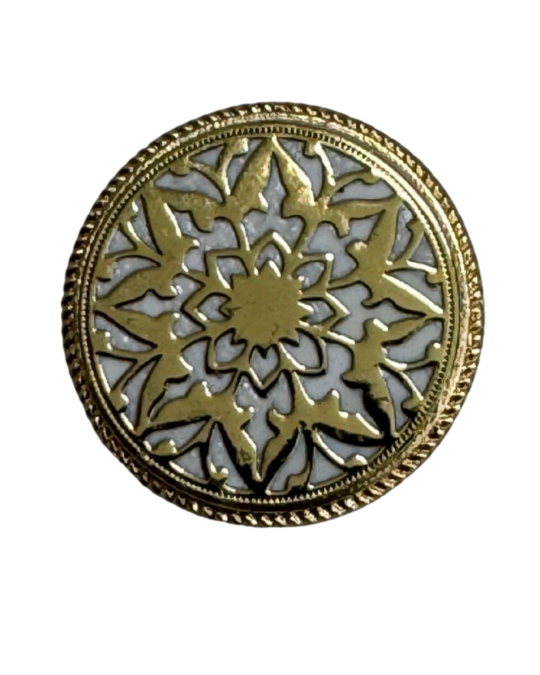 This 13-piece Bandhgala button set features an intricate floral jaal pattern inspired by traditional Tewa art. The antique gold motif rests beautifully over a soft ivory enamel base, creating a refined contrast that feels both regal and understated.
