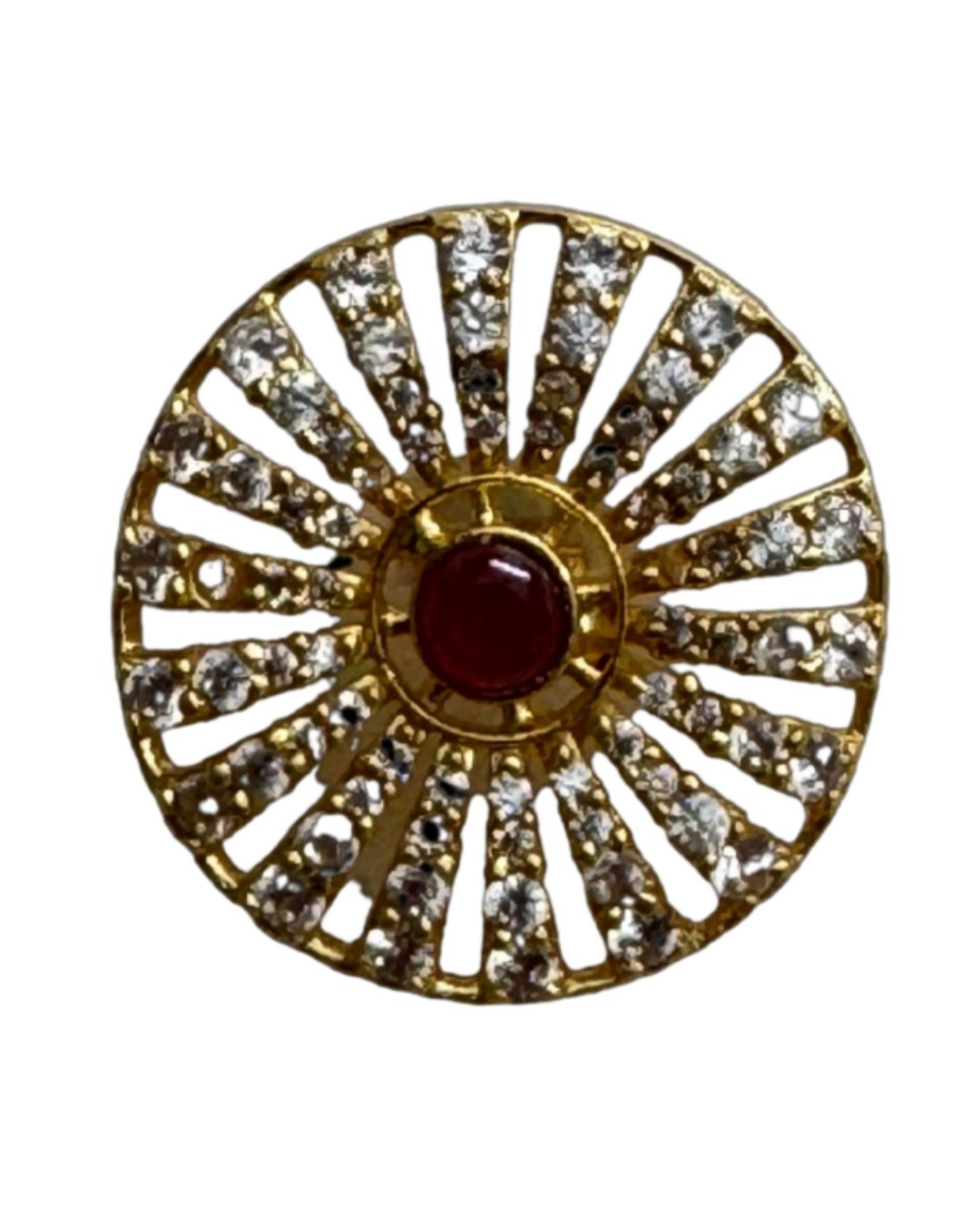 Crafted in premium brass, this 13-piece Bandhgala button set features a sunburst design studded with clear stones and a rich ruby-toned center. Designed to stand out on classic bandhgalas and Indo-western looks.