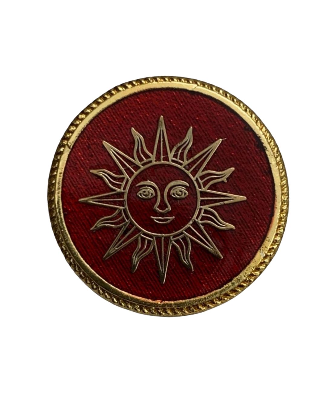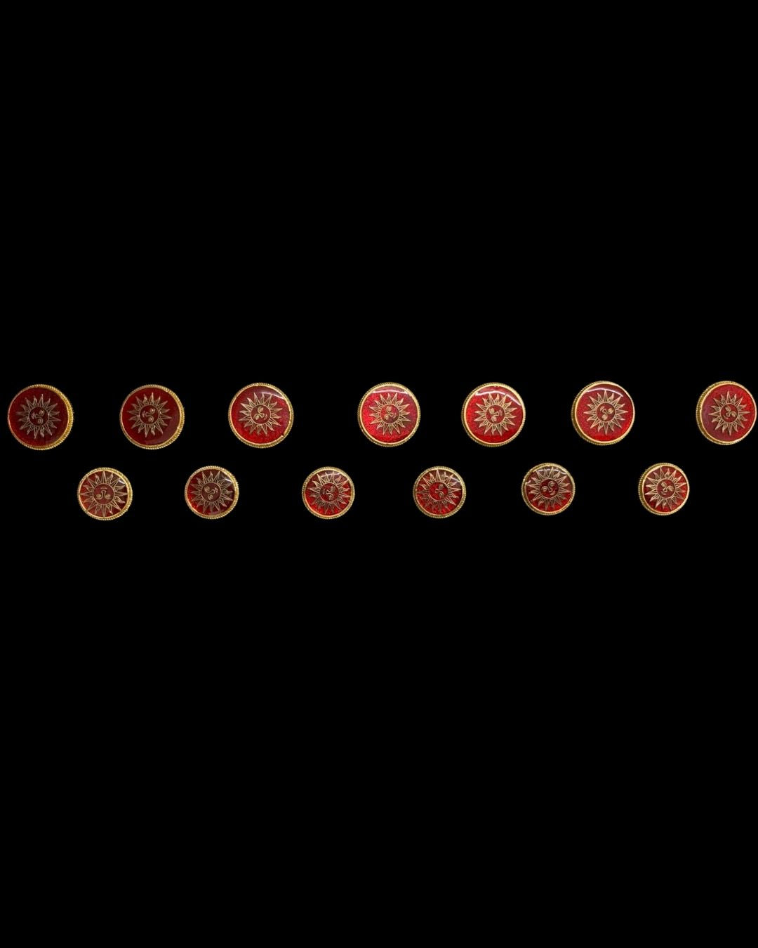 This 13-piece Bandhgala button set features a striking Surya motif, crafted in traditional Brass Tewa art. The radiant sun face, detailed in antique gold, sits boldly against a deep crimson enamel base—symbolising strength, energy, and royal lineage.
