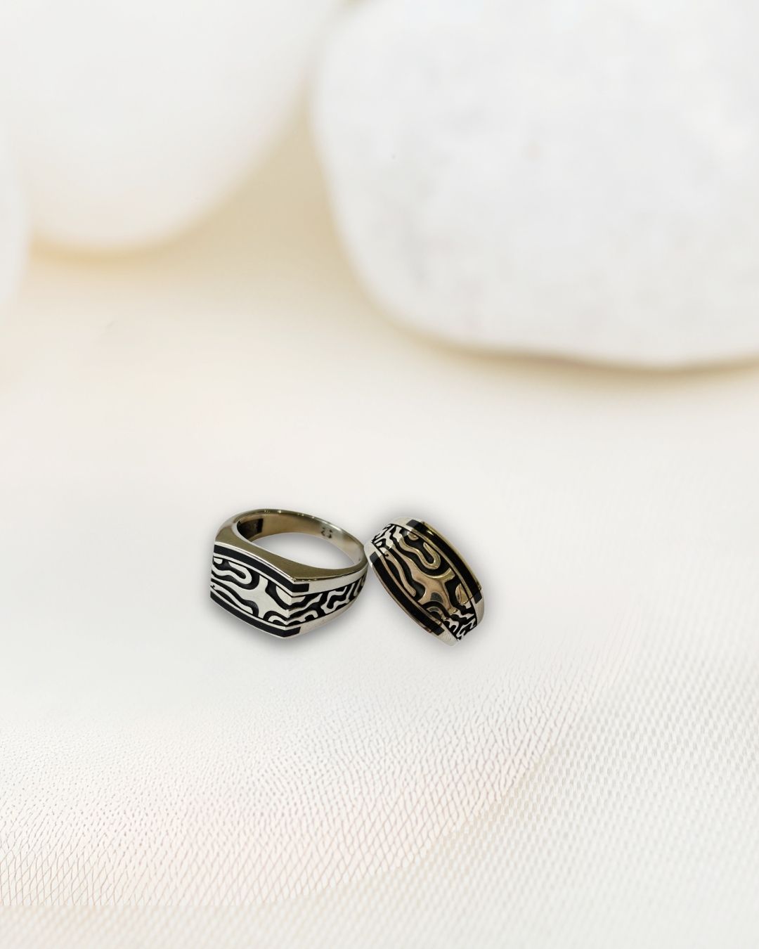 Bold, structured, and steeped in artistic expression — the Shilp Edge Silver Ring is a modern tribute to traditional Indian craftsmanship. Hand-forged in pure silver, the ring features an angular silhouette complemented by fluid, maze-like black etching inspired by tribal and topographic patterns.