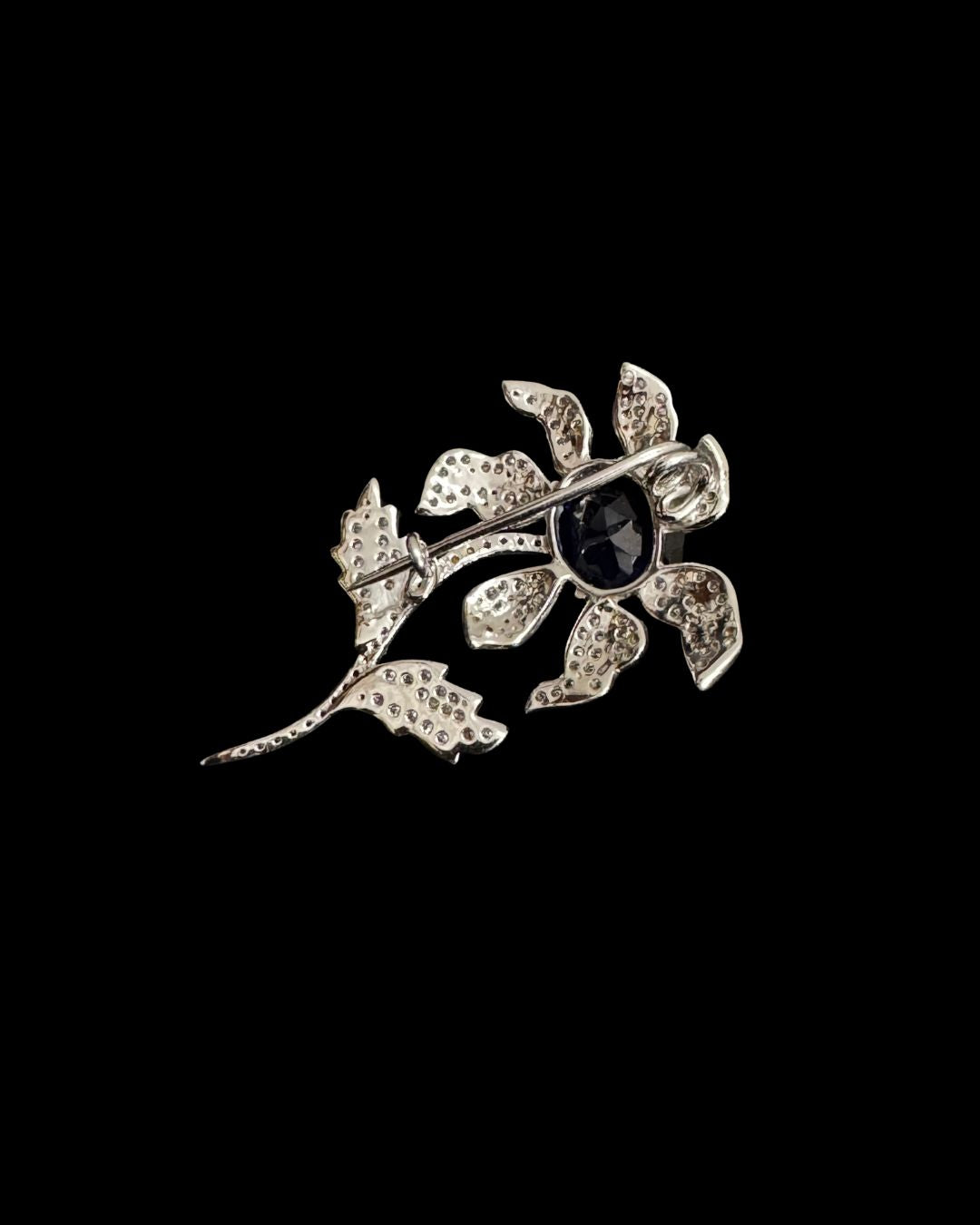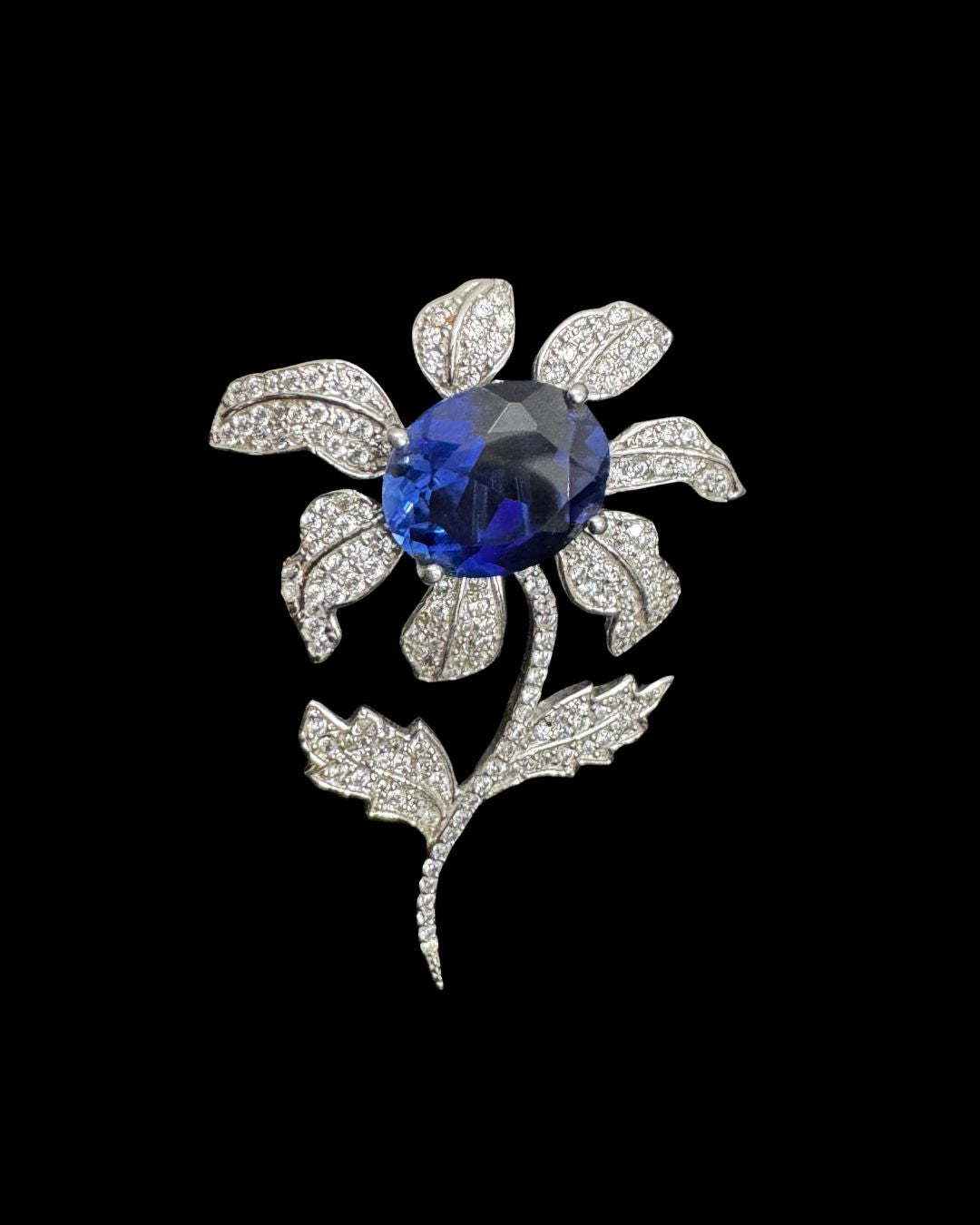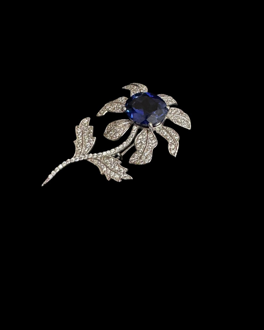 A refined floral brooch crafted in pure silver, centred with a deep blue stone that draws the eye instantly. The textured petals and leaves add a delicate sparkle, giving the piece a graceful, handcrafted charm. Perfect for bandhgala jackets, sherwanis, or evening wear, this brooch brings a quiet touch of elegance without trying too hard..