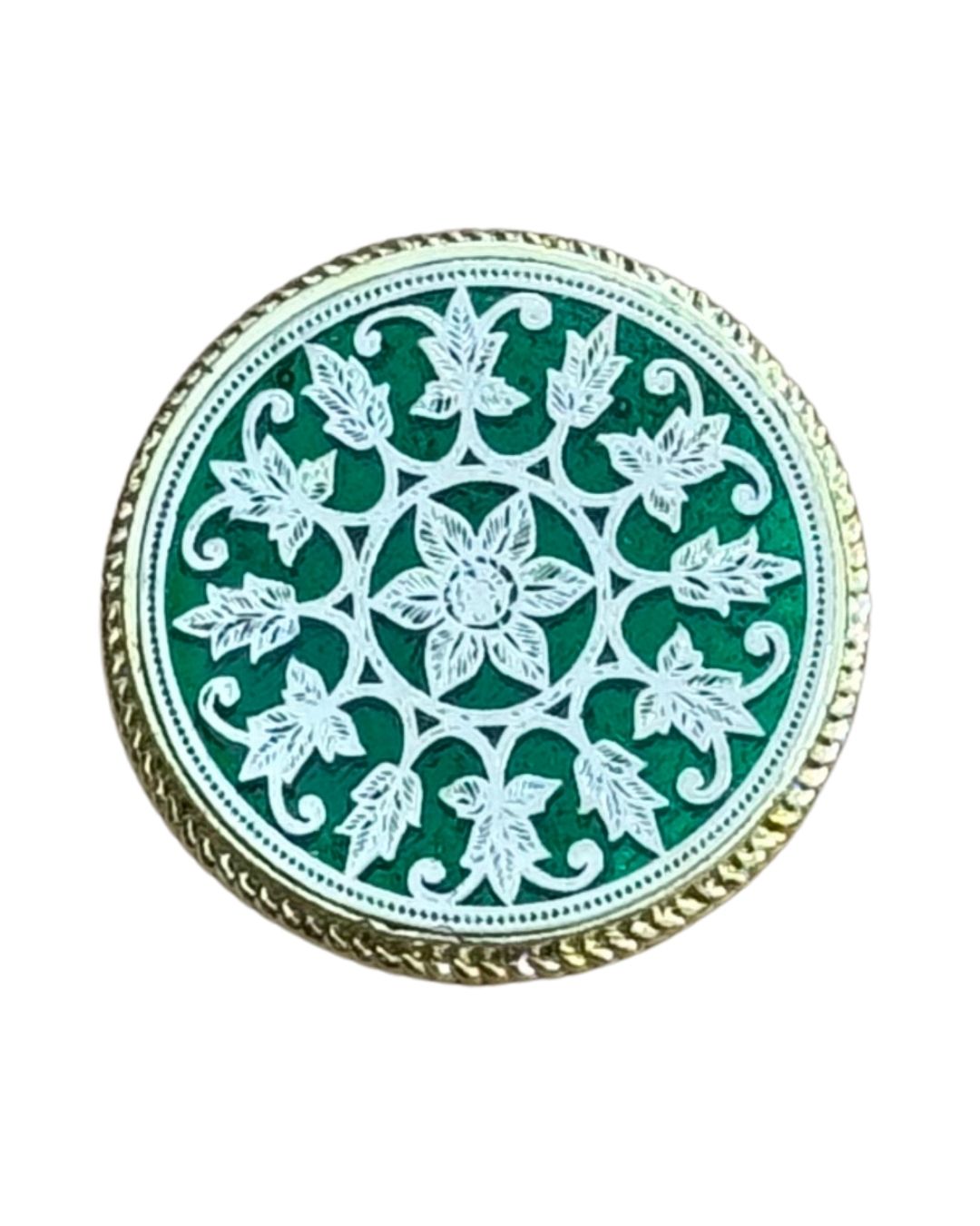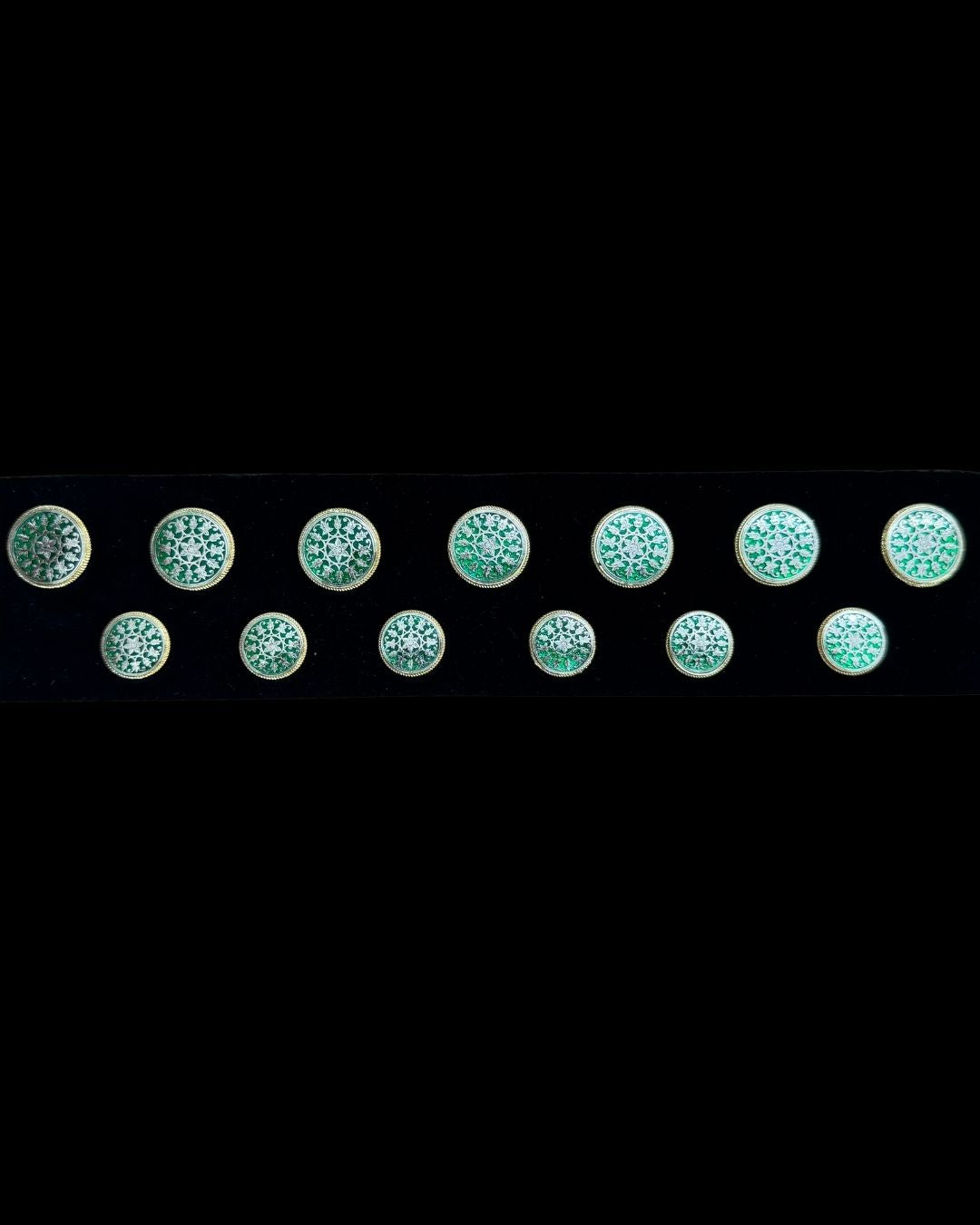 This 13-piece Bandhgala button set features a refined floral medallion pattern inspired by traditional Tewa art. The rich green enamel base is highlighted with delicate ivory detailing, framed in antique-finish brass for a balanced, heritage look.