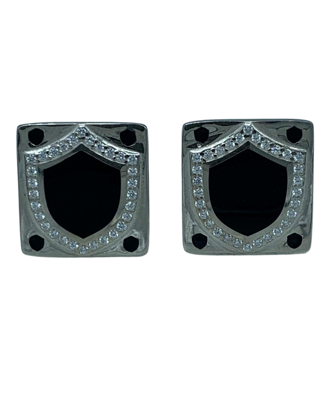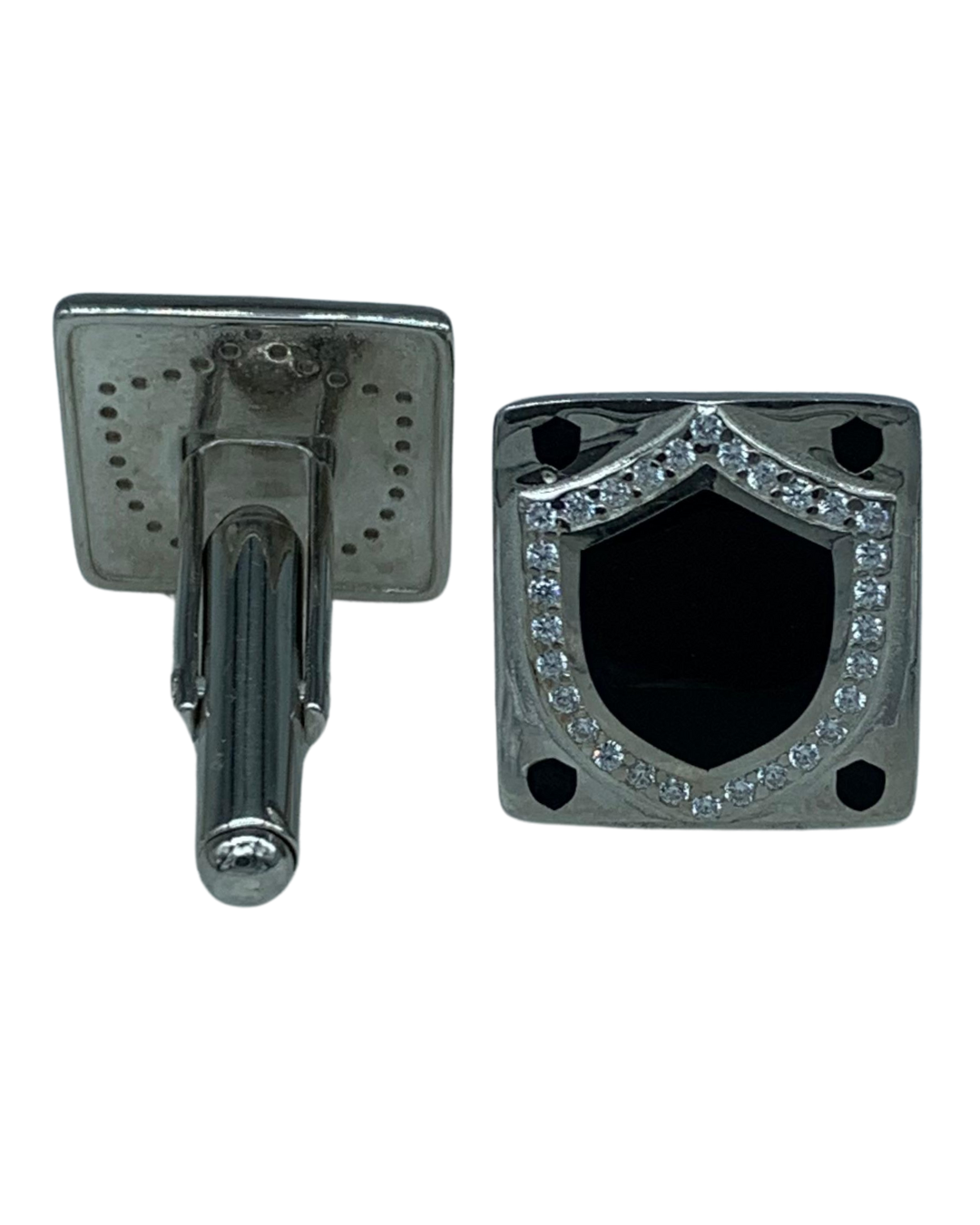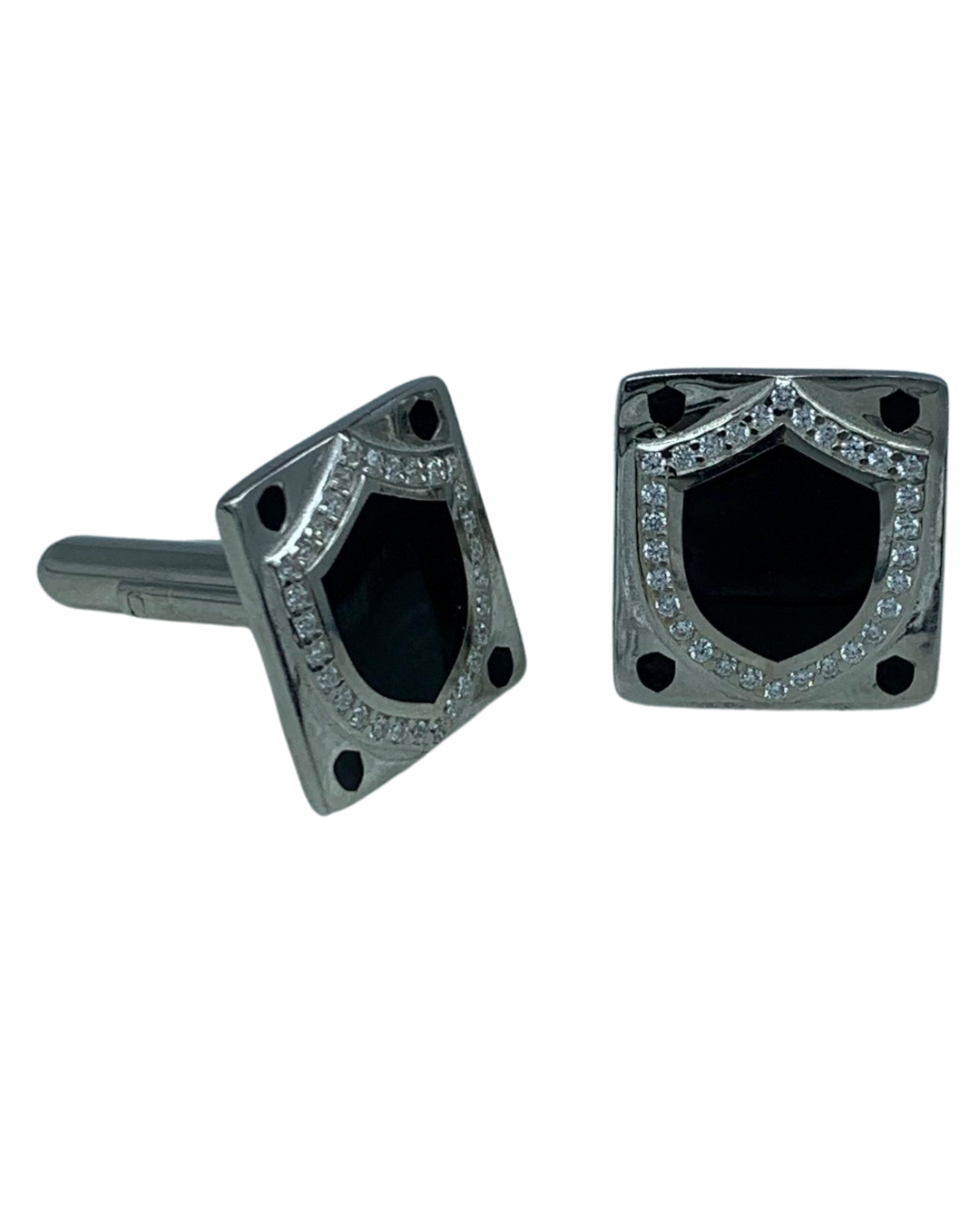 Inspired by the shield of a noble warrior, these Cufflinks blend strength and sophistication. Featuring a bold black enamel center with a surrounding halo of crystals, these 925 silver cufflinks command attention without a word.